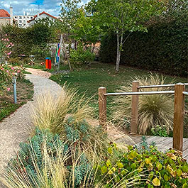 - À la MAS La Fontaine de Châtillon, qui accueille des enfants et adultes en situation de handicap mental et/ou psychique, nous avons conçu un espace extérieur agréable et apaisant, inclusif et accessible à tous.