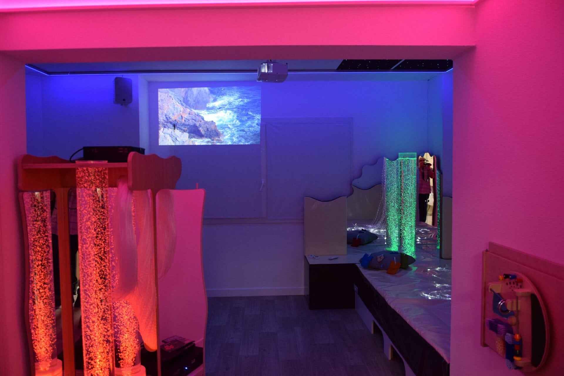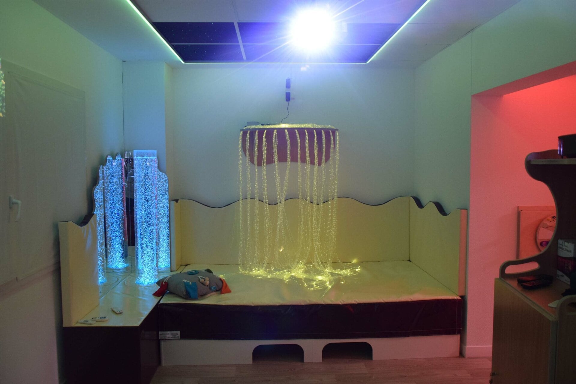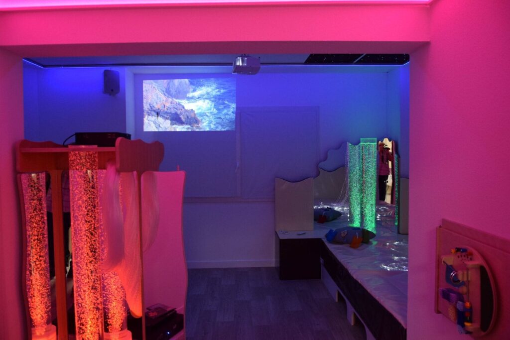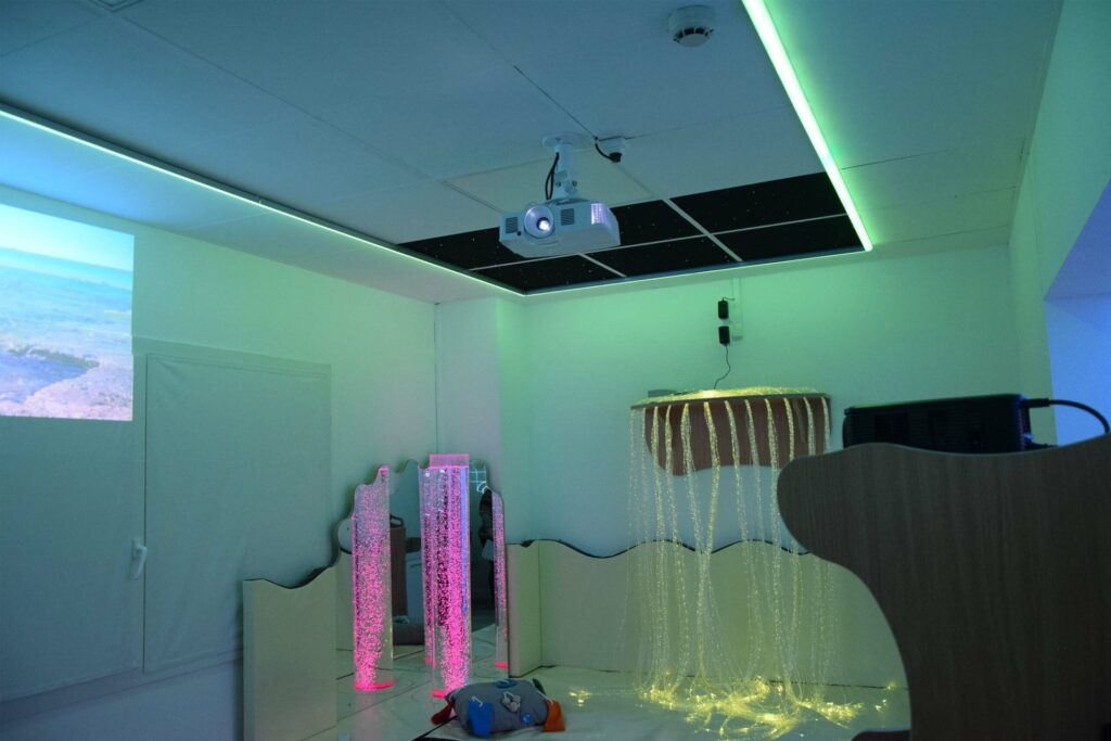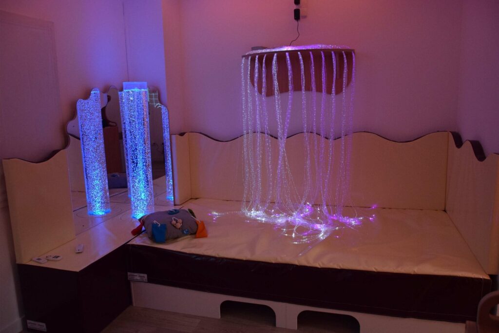 Philosophie Snoezelen intégré à l’EHPAD Coronis. L’équipe professionnelle de cet EHPAD a souhaité intégrer la philosophie Snoezelen particulièrement bien adaptée aux résidents atteints par la maladie d’Alzheimer. Cette maladie se traduit par des désordres sensoriels divers souvent liés à une incompréhension de l’environnement et de ces stimulations. L’approche Snoezelen va consister à placer la personne dans une situation de compréhension, donc de la sécuriser, puis de travailler sur des canaux sensoriels dans le but de rétablir une communication ou de développer une perception.