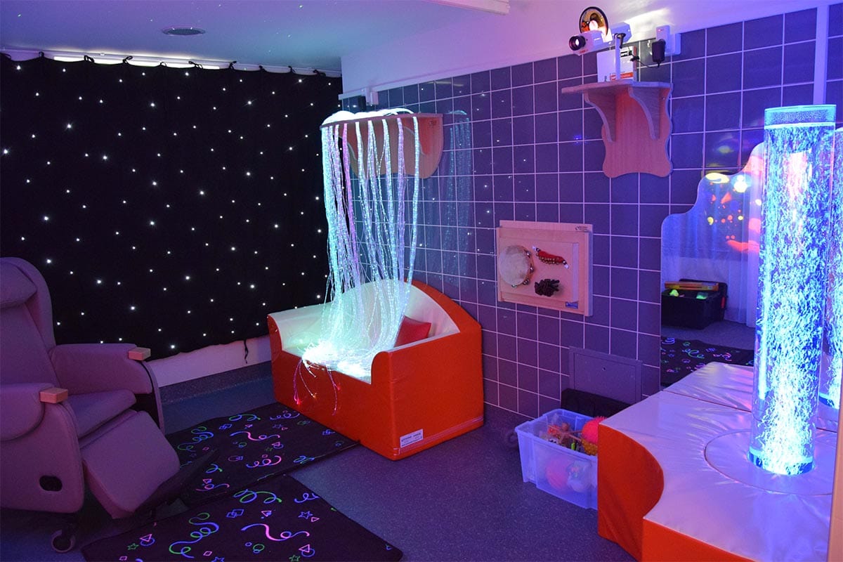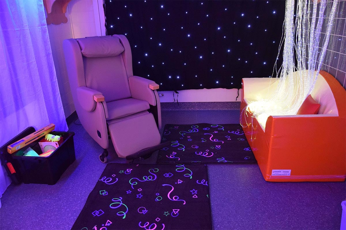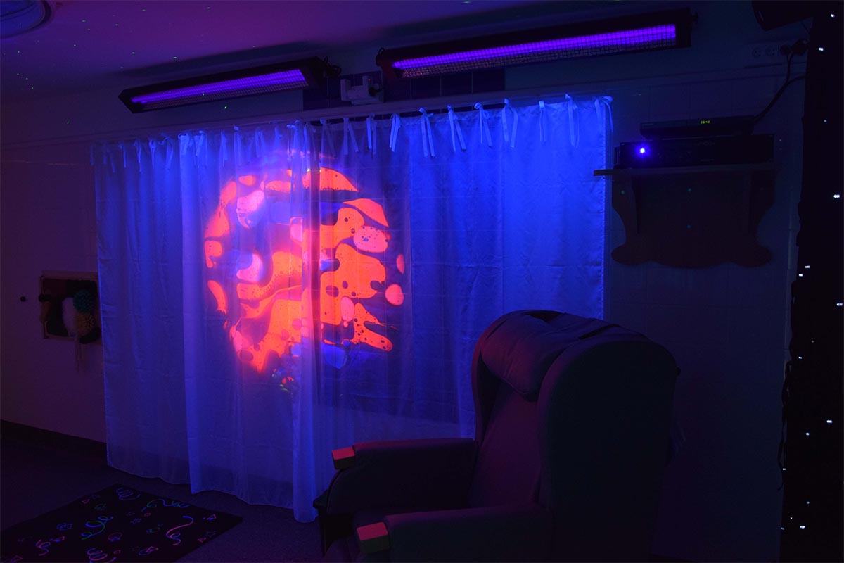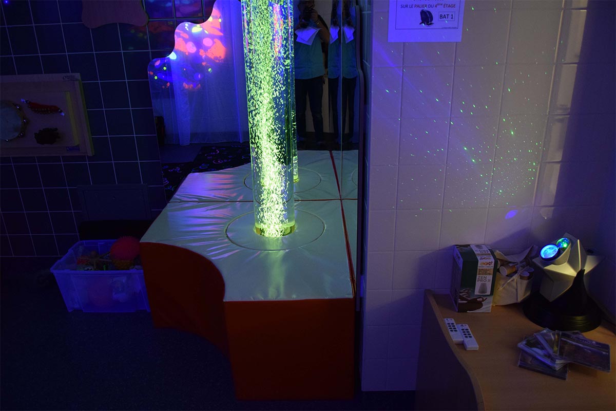 L’univers Snoezelen à l’EHPAD l’Orangerie à Ivry-sur-Seine (94). Cette salle Snoezelen vise à amener les résidents dans une perspective de détente, d’ouverture de soi aux stimulations extérieures.