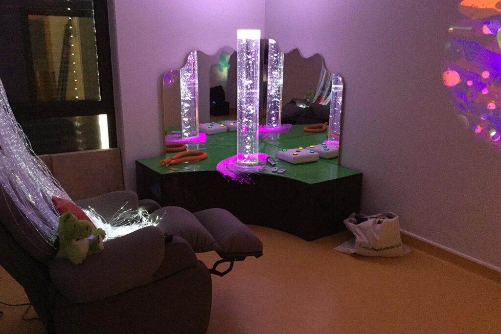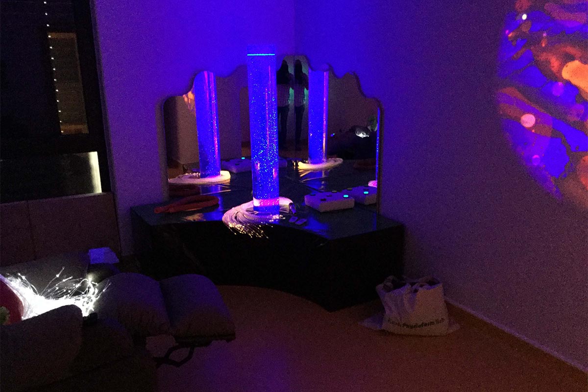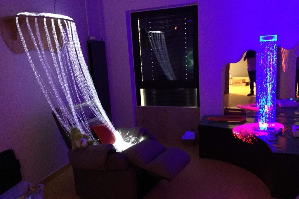 Salle dédiée à l’approche Snoezelen à la maison Hospitalière Saint Charles, permettant aux résidents de découvrir la philosophie Snoezelen. Cette philosophie permet une communication différente (non verbale et/ou verbale) avec les résidents, en exploitant les capacités restantes de ces derniers.