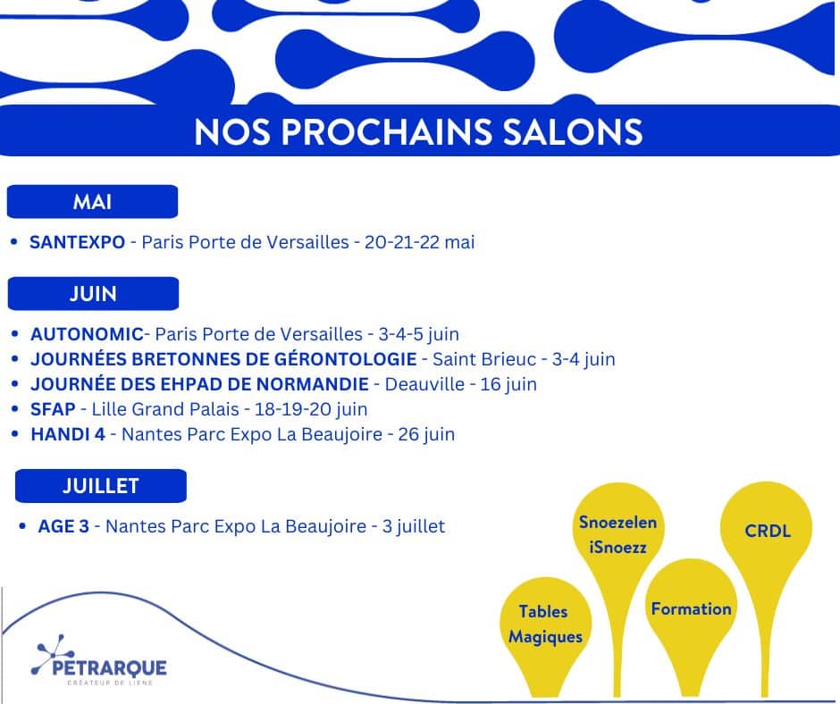 Vous souhaitez découvrir l’ensemble de nos solutions d’accompagnement : Snoezelen, iSnoezz, Tables magiques sensorielles, CRDL, Formation Snoezelen, Formation autisme..?Venez nous rencontrer sur nos stands !Autonomic, Santexpo, Petit 1, Age 3, Handi 4, SFAP…