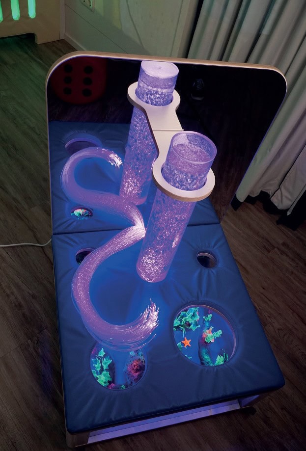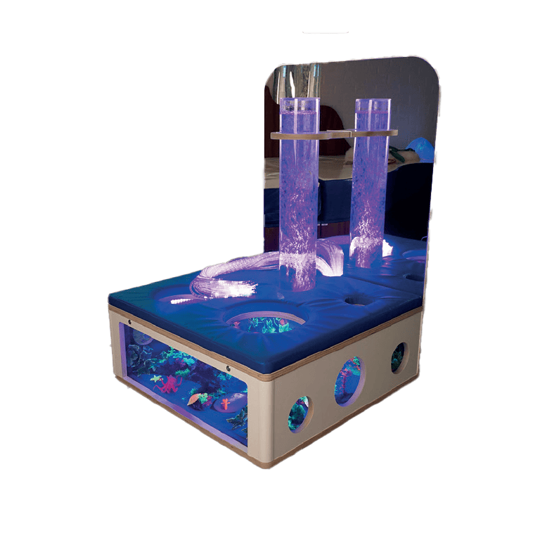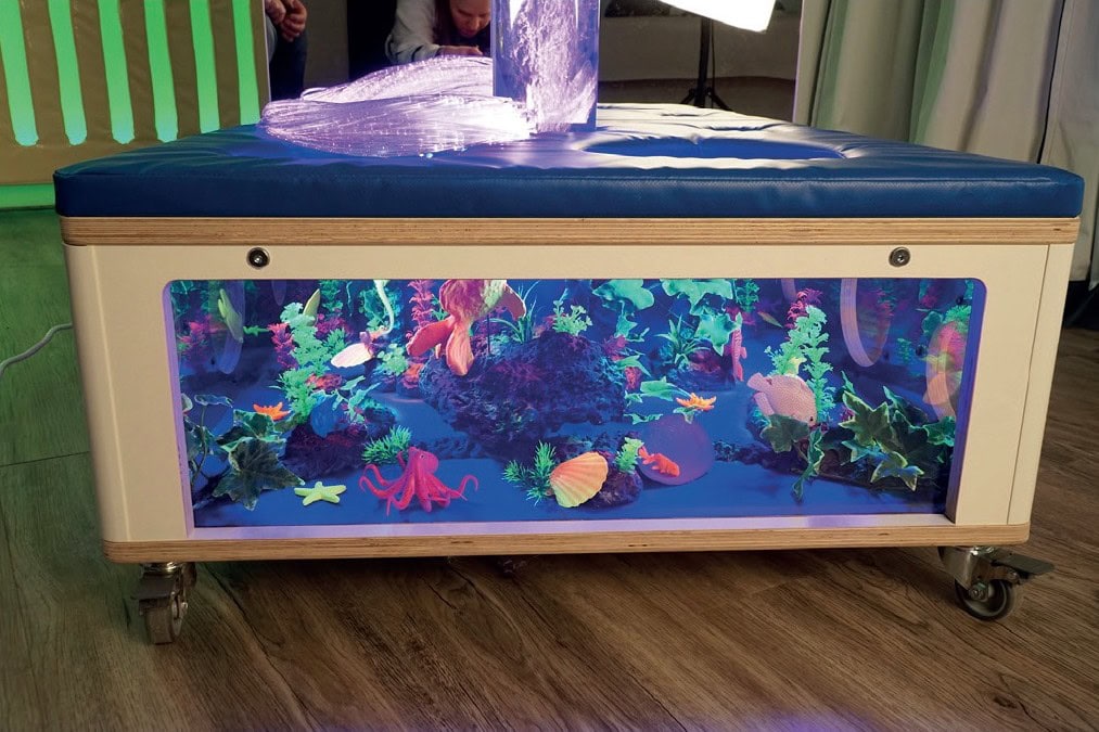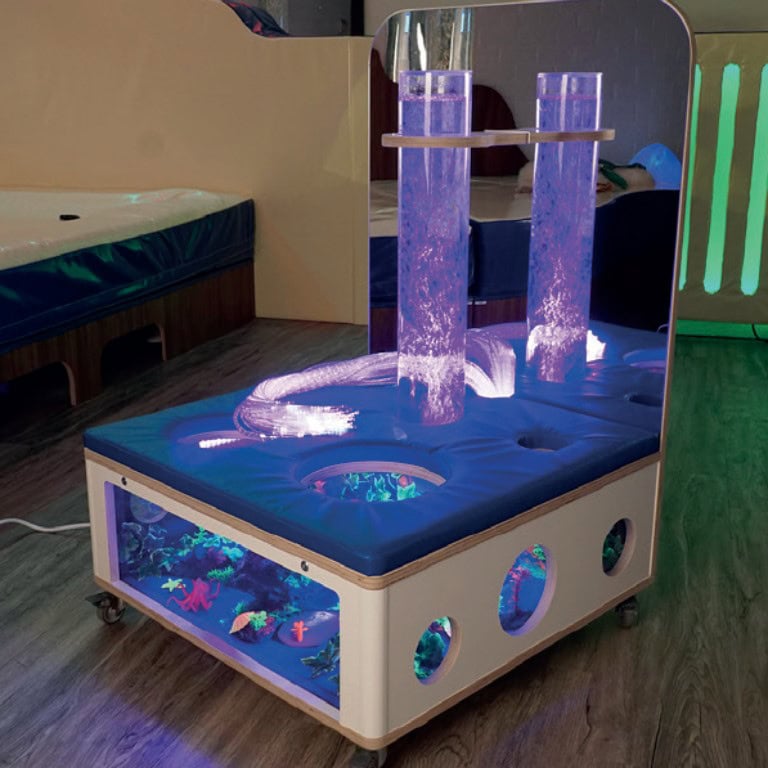 Ce chariot Snoezelen est spécialement conçu et équipé pour être adapté à en usage en crèche.